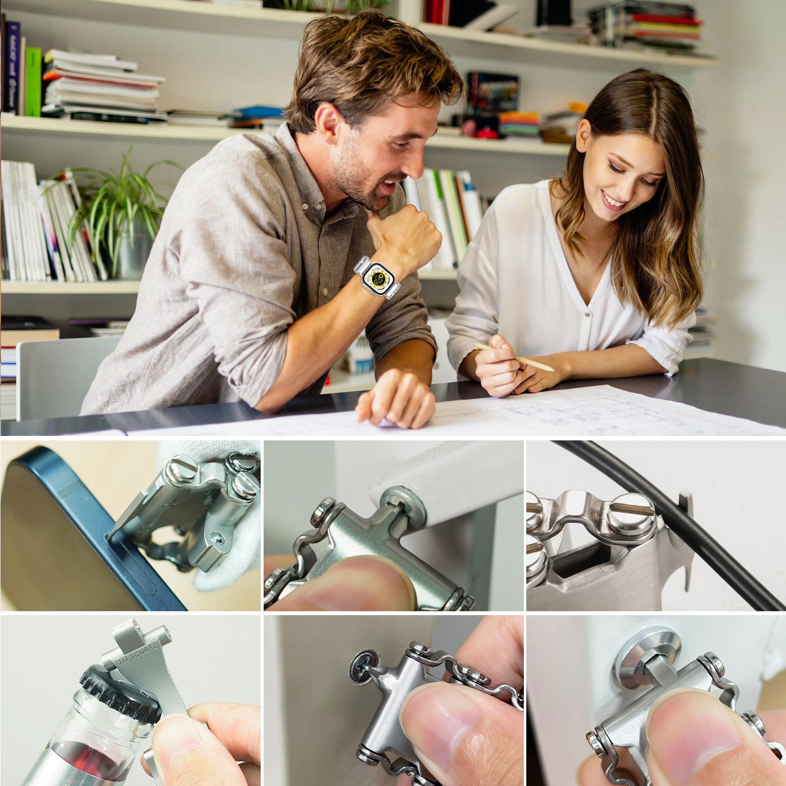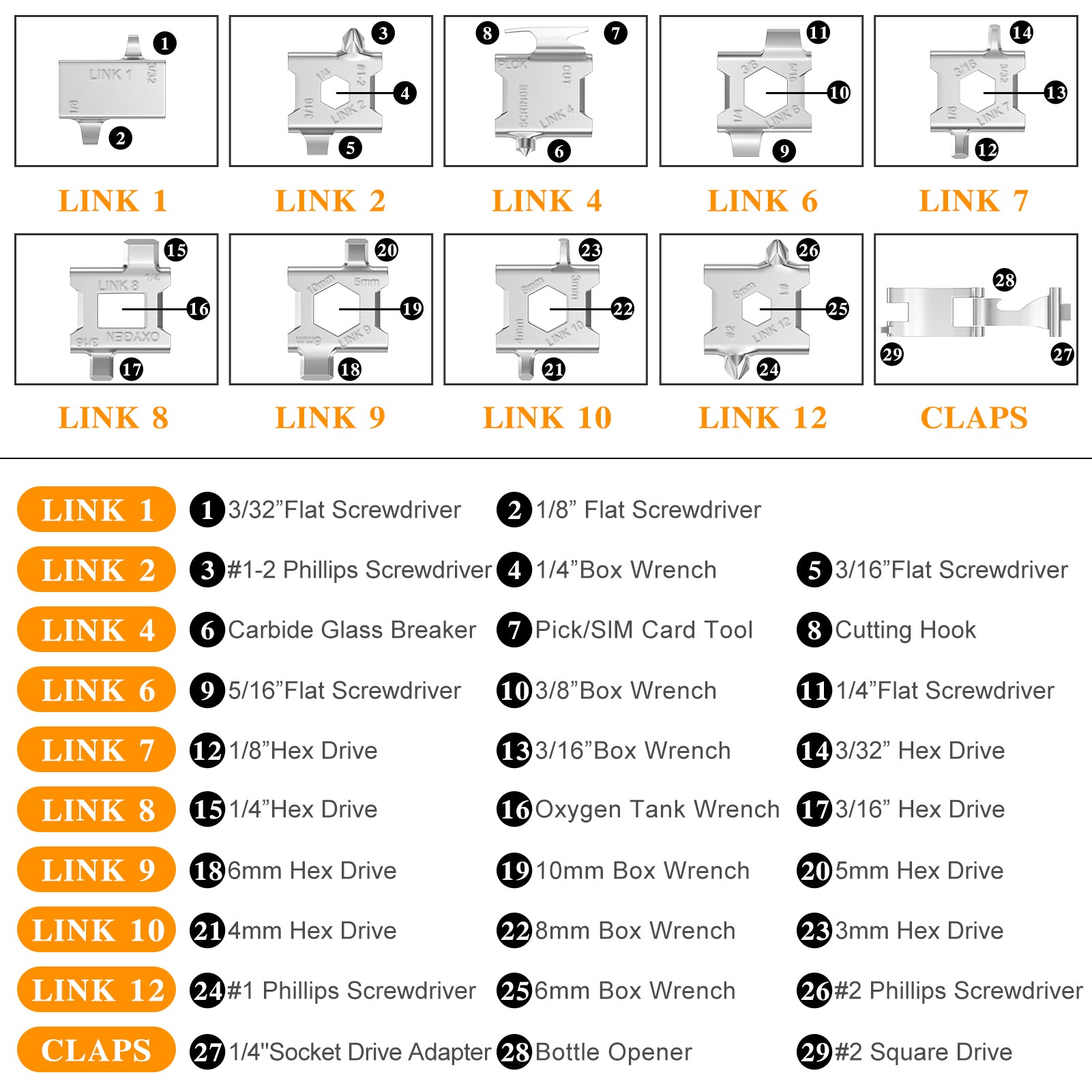 - 29 in 1 Multi-function Design: This is a versatile tool apple watch band that includes a variety of flat, Phillips, and hex screwdrivers, along with box wrenches and hex drives in multiple sizes. It also features special tools such as a carbide glass breaker, SIM card tool, cutting hook, oxygen tank wrench, socket drive adapter, and bottle opener. These tools are connected and secured using links and clasps for easy carrying and use, meeting a wide range of repair and assembly needs