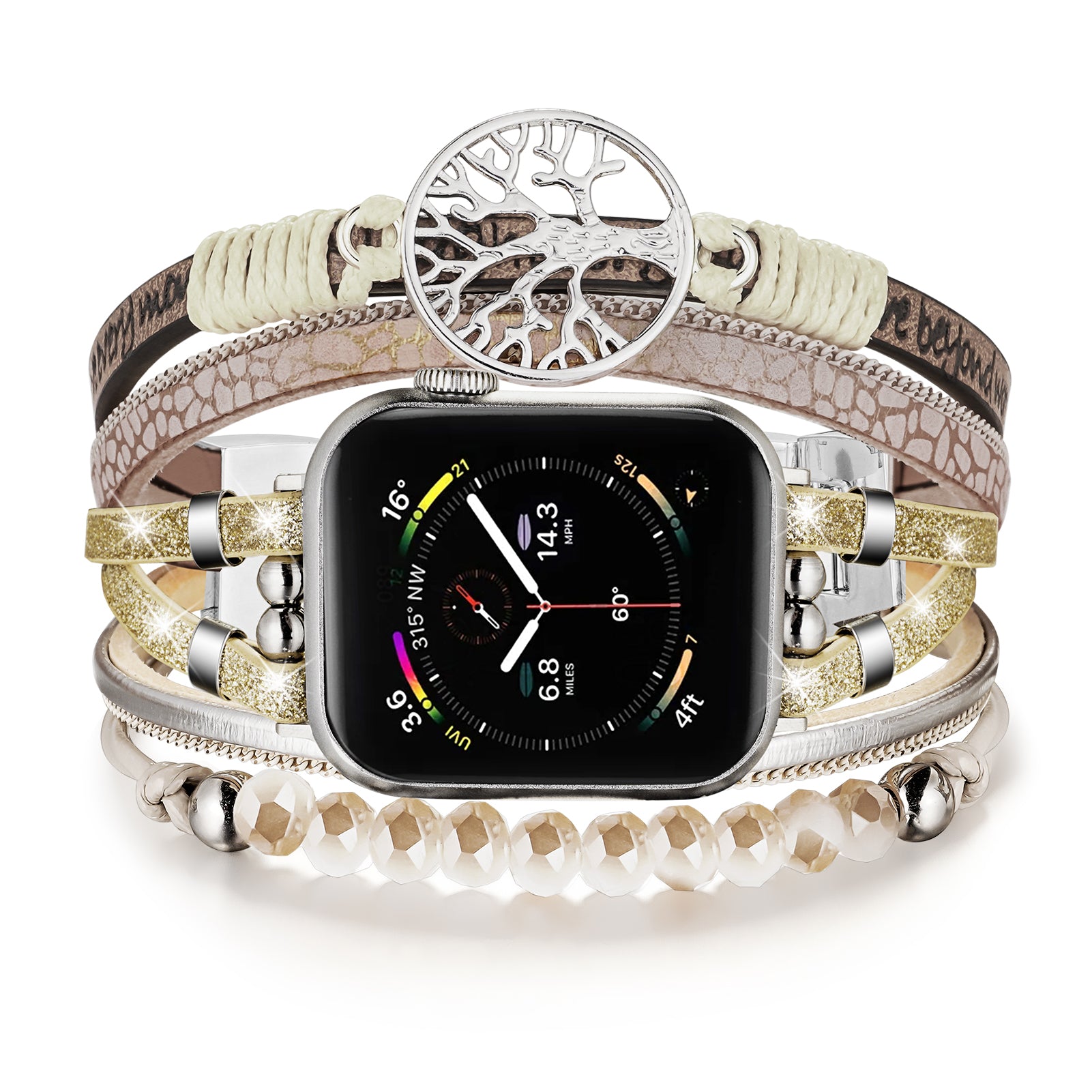 - Adjustable Size: Genuine multilayer bracelet apple watch bands for women suitable for wrist 5.5-7.5 inch. Boho iwatch bands for women has four metal buckle connectors that allow you to adjust the strap size according to your wrist, making it easy to remove and assemble without tools